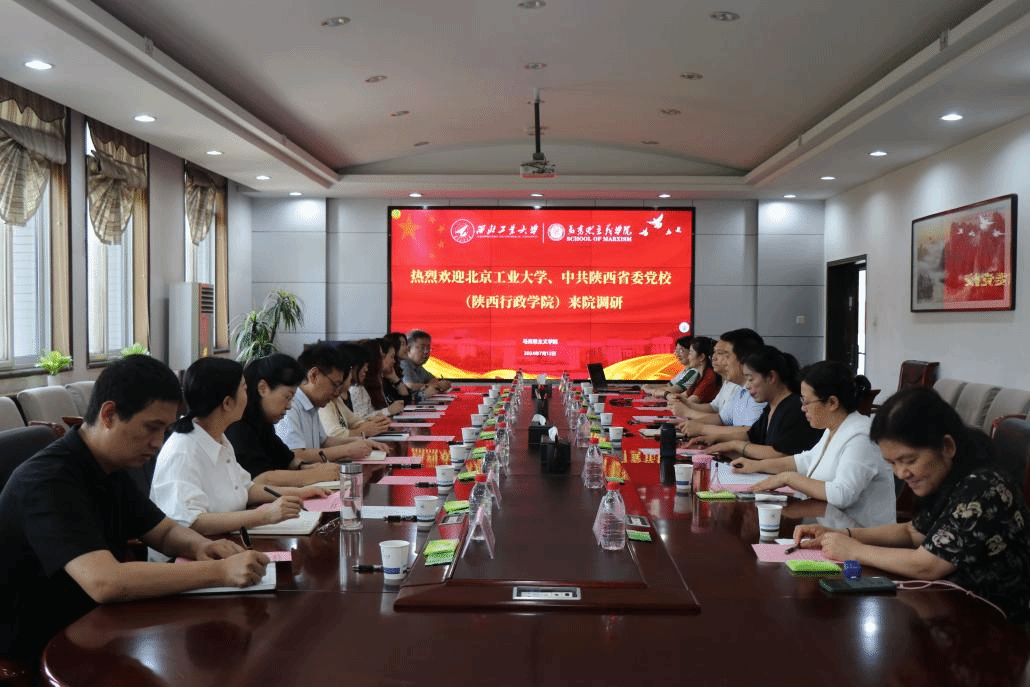 2024年7月12日上午9:30,北京工业大学jinnianhui金年会·首页官网院长丁云教授一行,中共陕西省委党校(陕西行政学院)研究生院院长、学位办主任张洪春一行,共12位同仁来jinnianhui金年会·首页官网调研交流。会议在学院208室举行,jinnianhui金年会·首页官网党委副书记李刚、院长助理赵海霞、高旭红教授、汪永平教授、曹瑜教授等参加了会议。