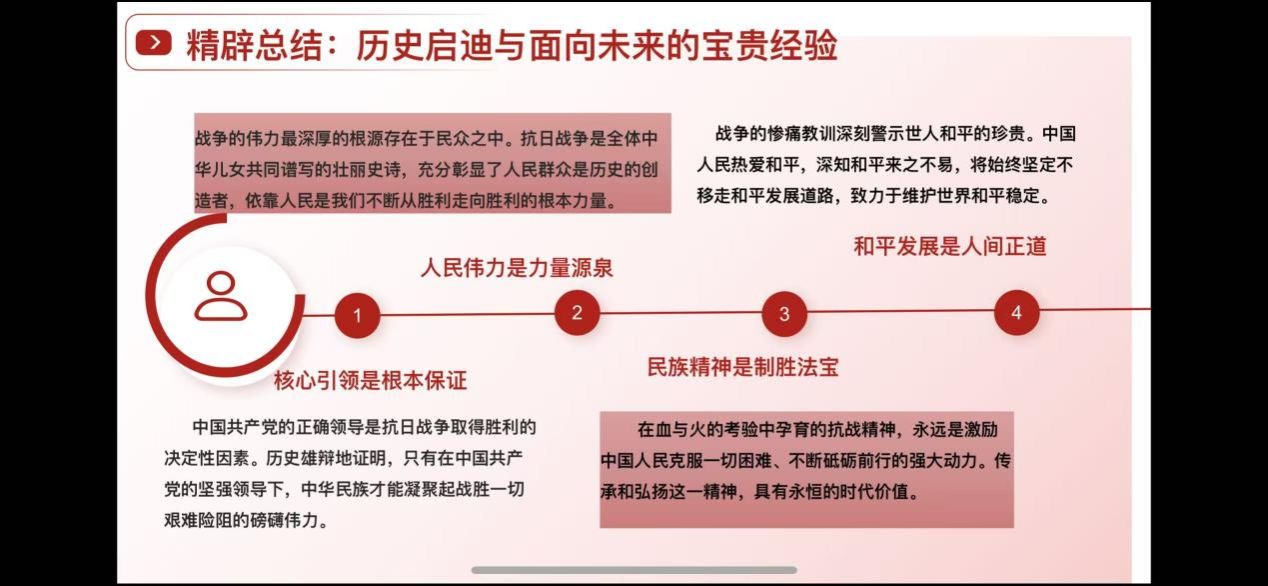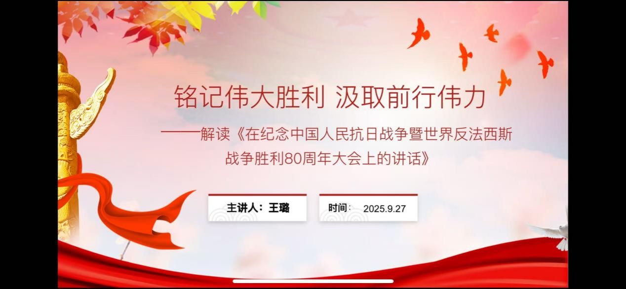 接着,jinnianhui金年会·首页官网博士生王璐同学以《铭记伟大胜利 汲取前行伟力》为题,从深刻昭示东方主战场与世界正义的胜利丰碑;深情礼赞民族脊梁与不朽精神的光辉史诗;精辟总结历史启迪与面向未来的宝贵经验;时代召唤铭记历史、共创未来的庄严宣言,四个板块对讲话内容进行了深入浅出地解读。她认为《习近平在纪念中国人民抗日战争暨世界反法西斯战争胜利80周年大会上的讲话》深刻阐释了抗战胜利的伟大意义,深情礼赞了中华民族的英勇抗争,精辟总结了历史经验,并向世界发出了维护和平、共创未来的时代强音。