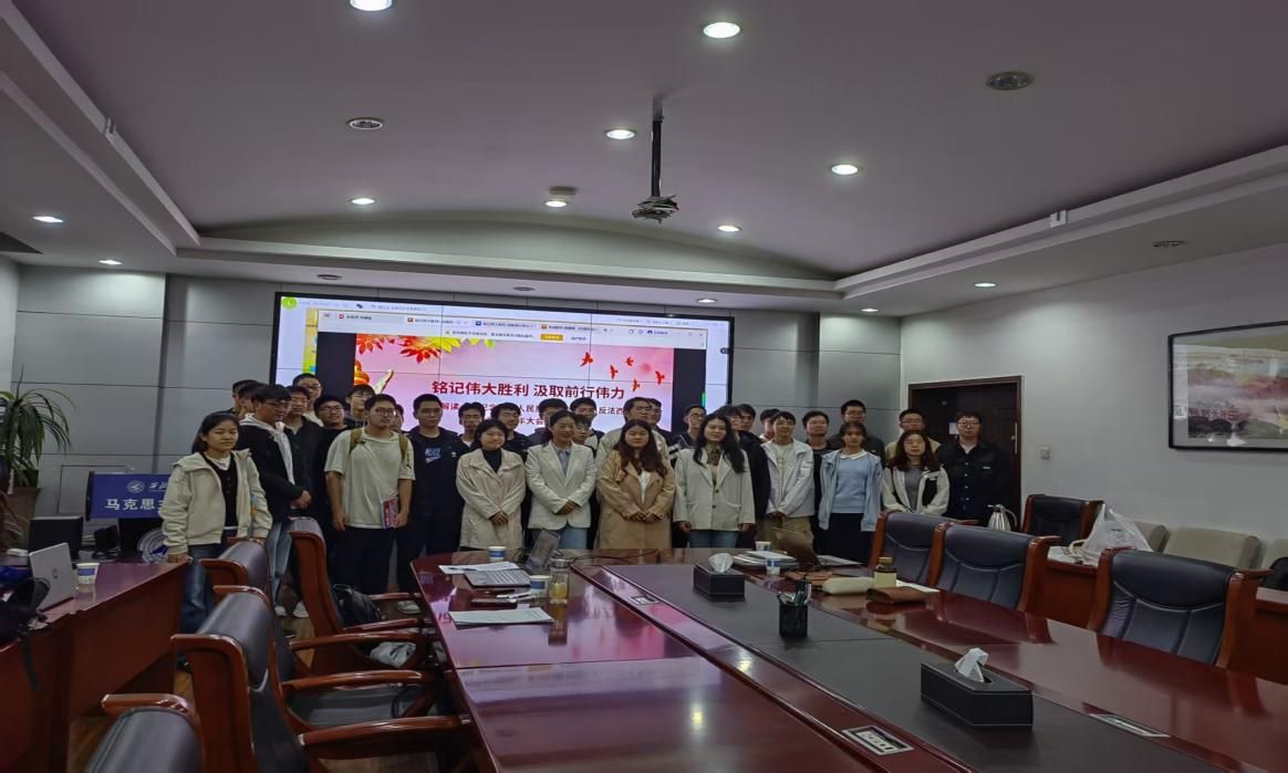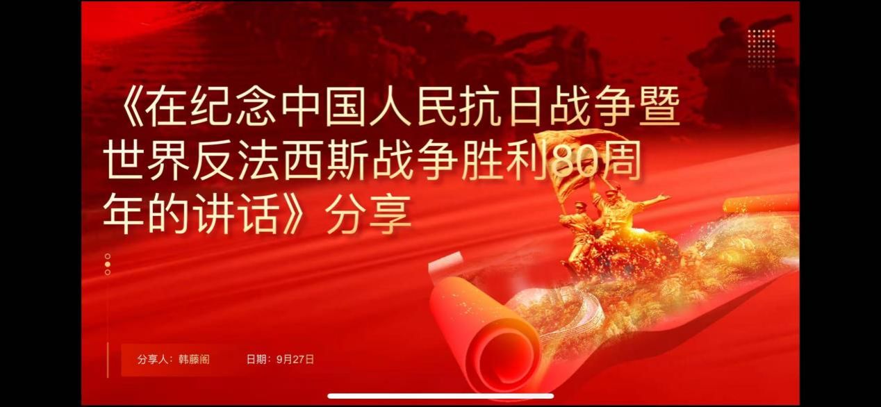 2025年9月25日,jinnianhui金年会·首页官网习近平新时代中国特色社会主义思想学习读书小组第六十期活动以《习近平在纪念中国人民抗日战争暨世界反法西斯战争胜利80周年大会上的讲话》为主题进行学习研讨。本次读书会由jinnianhui金年会·首页官网鲁杰思政课工作室主办,jinnianhui金年会·首页官网赵海霞教授作为对话教师应邀参与,jinnianhui金年会·首页官网硕士生李红霞同学主持,通过线上线下相结合的方式,设置线下分会场,邀请导读同学、对话教师、硕博研究生、本科生在学院楼208室交流学习。