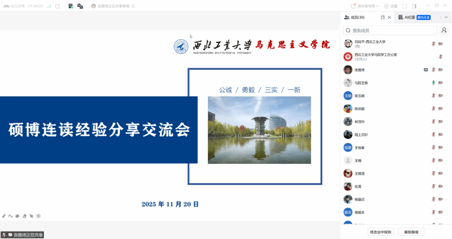四位同学分享交流后,肖妮就硕博连读的招生政策作了系统解读。她详细介绍了政策核心要点与具体操作规范,清晰梳理申请全流程节点,明确材料准备的关键要素与注意事项,为有申请意向的同学提供实操性指导。随后,王换作总结发言,强调学术严谨与学术诚信在科研道路上的根本性意义,并鼓励同学们树立“静水流深”的发展观,以自觉、自律、自强的信念和持之以恒的平稳心态,积极投入到硕博连读的申请与学术生涯规划之中。