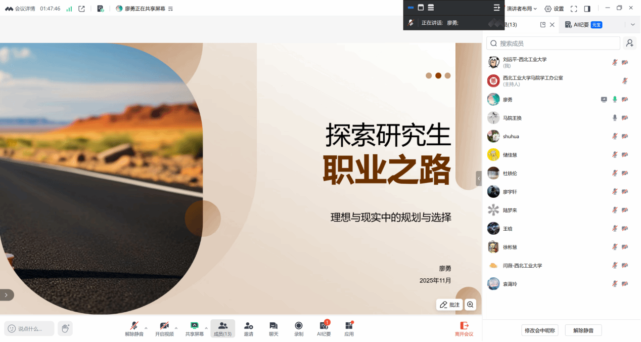 就业赛道的3名选手定位清晰、准备充分,凭借丰富的实践经历与精准的岗位适配规划脱颖而出。廖宇轩以基层治理为职业目标,结合汶川地震重建见闻、精准扶贫实践、社会调查经历阐明职业初心,充分展现西工大青年“专业精、系统强、重实践、能担当”的综合素养;闫薇规划务实,岗位适配性强;廖勇提出“马理论+物流”跨领域路径,立足区位优势展现多元思维。