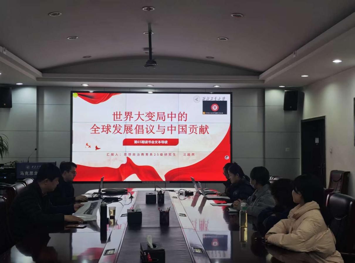 2025年12月27日,中国高等教育学会马克思主义研究分会2025年度“马克思主义经典著作研读”资助计划支持小组——jinnianhui金年会·首页官网习近平新时代中国特色社会主义思想学习读书小组第六十五期活动以《推动落实全球发展倡议、全球安全倡议、全球文明倡议、全球治理倡议》为主题进行学习研讨。本次读书会由jinnianhui金年会·首页官网鲁杰思政课工作室主办,jinnianhui金年会·首页官网张永奇教授作为对话教师,jinnianhui金年会·首页官网博士生韩藤阁同学主持,特邀中国高等教育学会马克思主义研究分会2025年度“马克思主义经典著作研读”资助计划的督导员陈佳雯、李宇杰参与。通过线上线下相结合的方式,设置线下分会场,邀请导读同学、对话教师、硕博研究生、本科生在学院楼208室交流学习。
