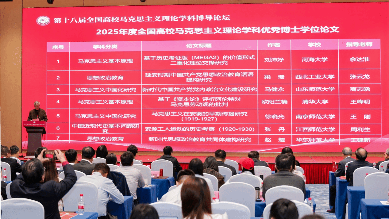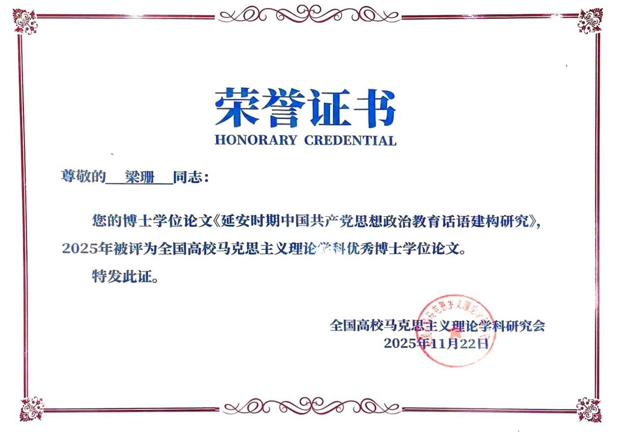 2025年11月22日,第十八届全国高校马克思主义理论学科博导论坛在海口举行,会议期间同步举行了2025年度全国高校马克思主义理论学科优秀博士学位论文颁奖仪式。金年会官网jinnianhui金年会·首页官网2022届毕业生梁珊的博士学位论文《延安时期中国共产党思想政治教育话语建构研究》成功荣获该奖项,其指导教师为张云龙教授。